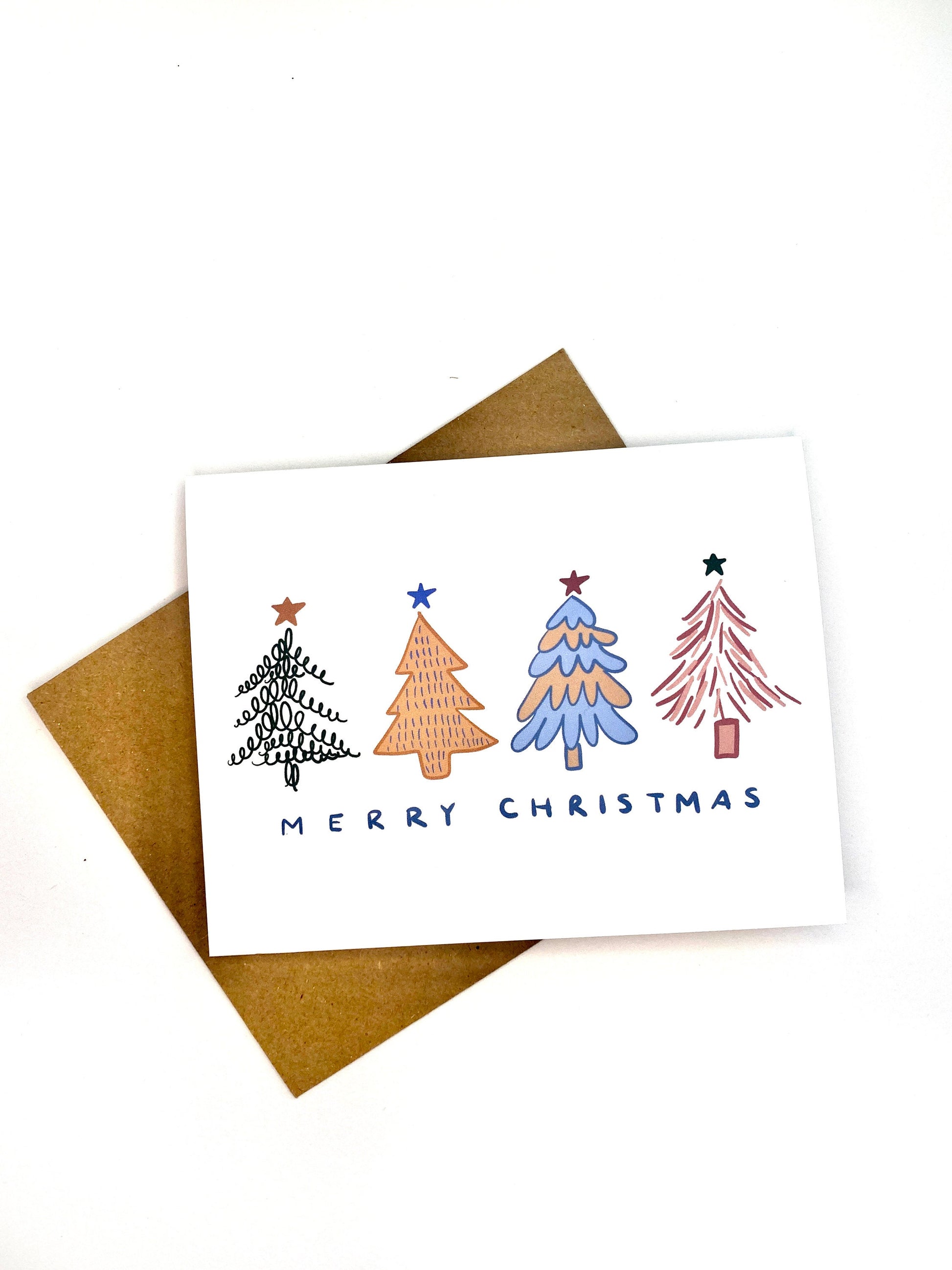 Merry Christmas Card - Modern Colorful Christmas Trees - Blank Inside - Kraft Envelope