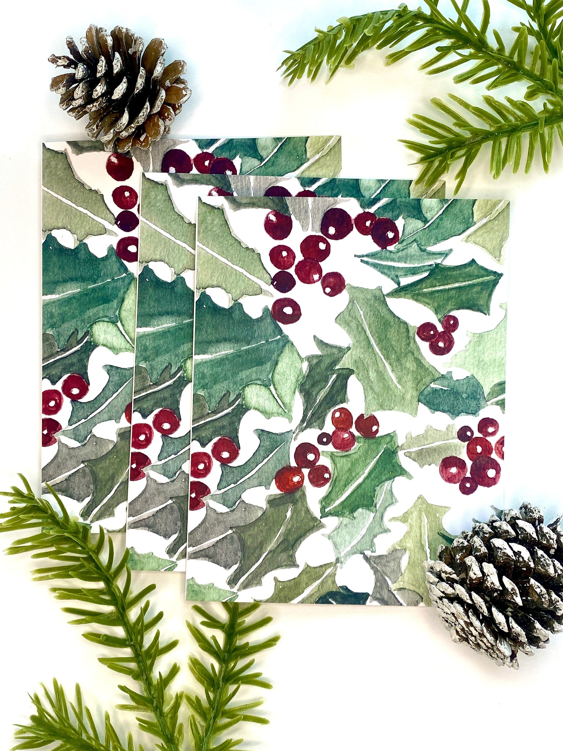Watercolor Holly Christmas Card - Mistletoe - Blank Inside - Kraft Envelope